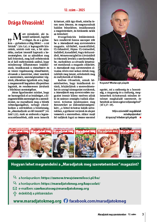 A Maradjatok meg szeretetemben legújabb, 12. számában olvashattok hitünk misztériumaival foglalkozó cikkeket, valamint nem mindennapi tanúságtételeket arról, hogy hogyan működik Isten az ember életében. Örömteli és hasznos olvasást kívánunk!